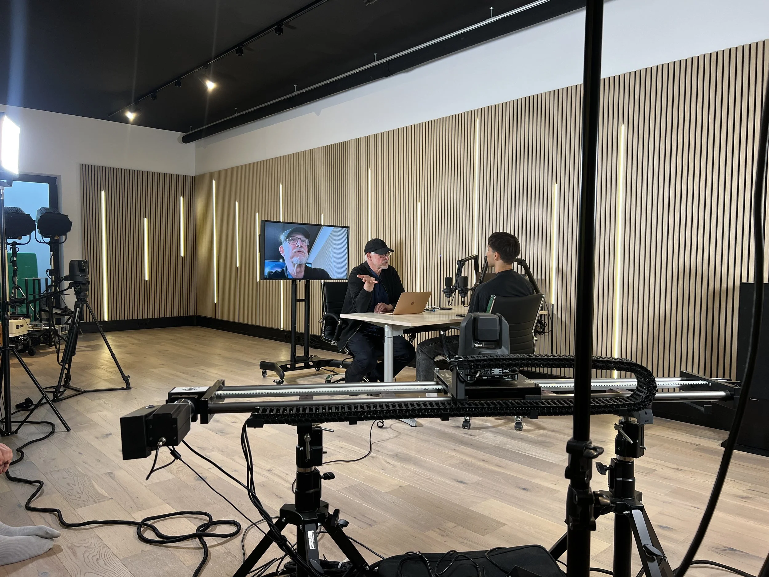 Gib Deinem Podcast ein Gesicht! Mit bis zu sechs 4K-Kameras, automatischer Sprechererkennung und Motion-Graphics inszenieren wir Dein Gespräch als dynamischen